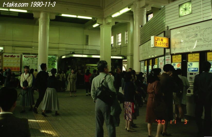 子供自分に撮った写真です。こんな感じでした。奥が改札口、券売機の右側がみどりの窓口だったと思います。駅舎の位置は、駅の高架化と、観光案内所化工事で、少し東よりに移動しています。