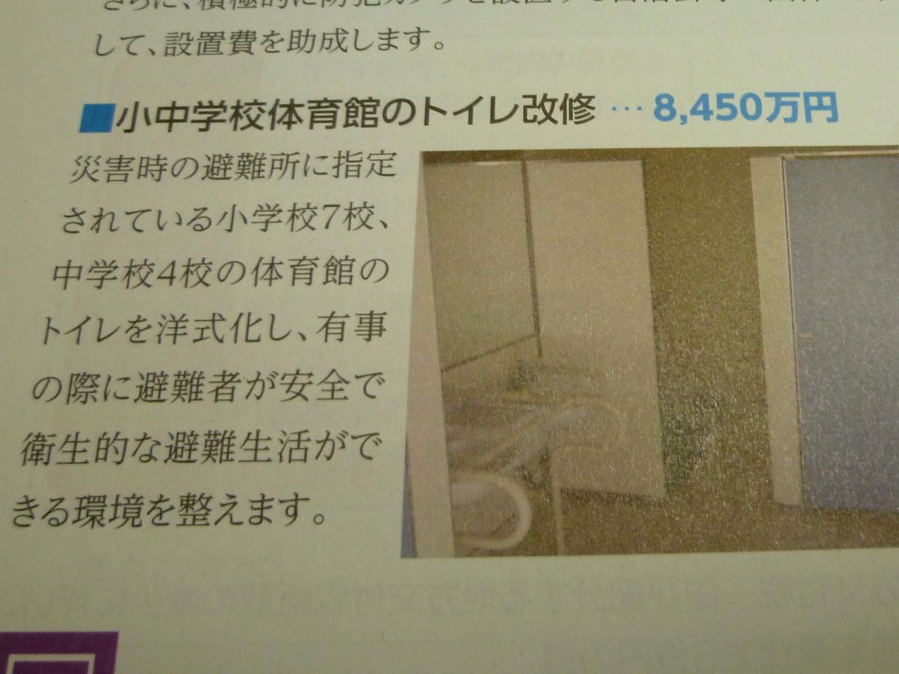 まず、トイレの改修は喫緊の課題といえます。昔から、学校のトイレには苦労させられました。汚く、痛んでおり、登番で掃除をしても、いい思い出はありません。災害時の避難所の際の問題もあり、改修工事の進捗を望みたいです。