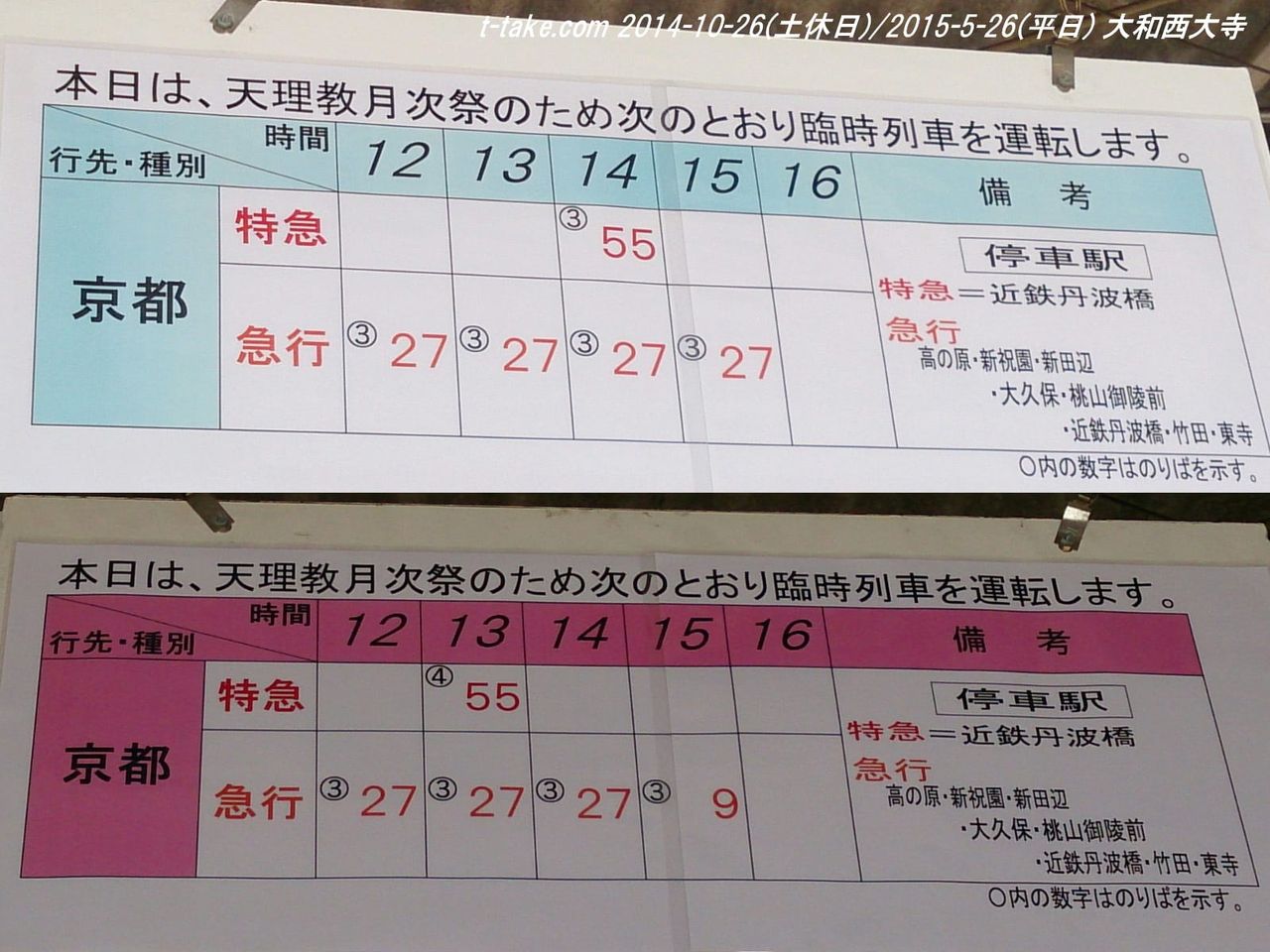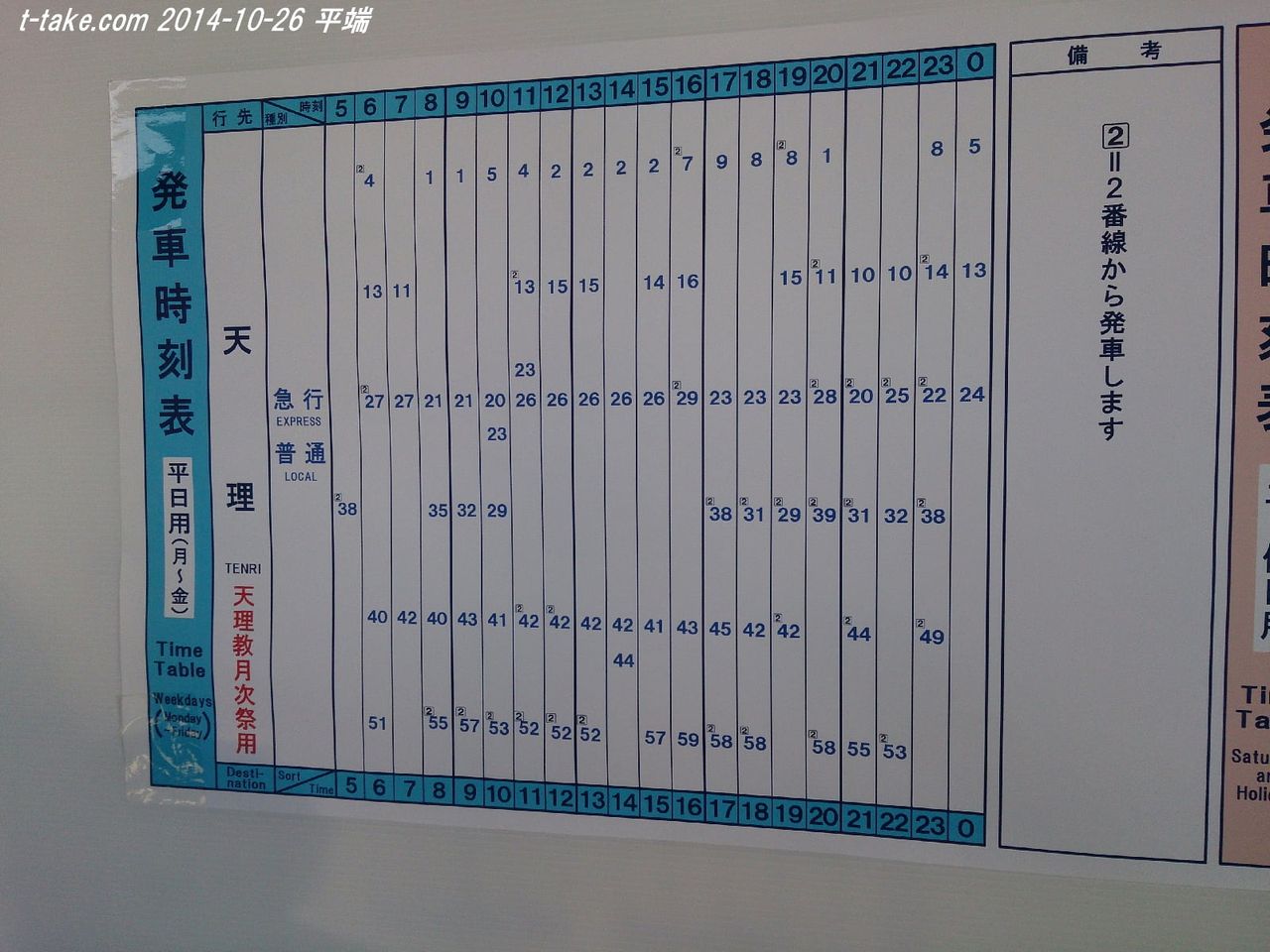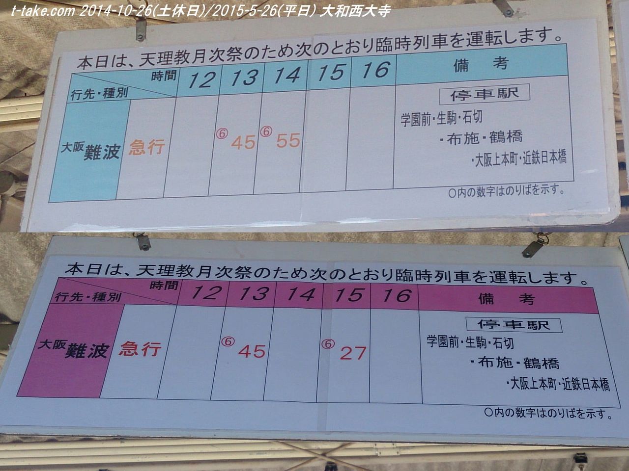 ツイッターで予想以上に、天理駅の到着時刻表が好評でしたので、過去撮影の土休日分も含めて、ブログでまとめて、天理臨関係駅掲出時刻表を掲載します。
