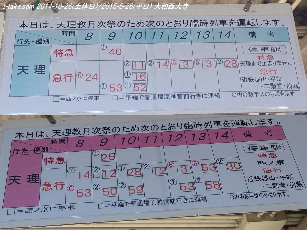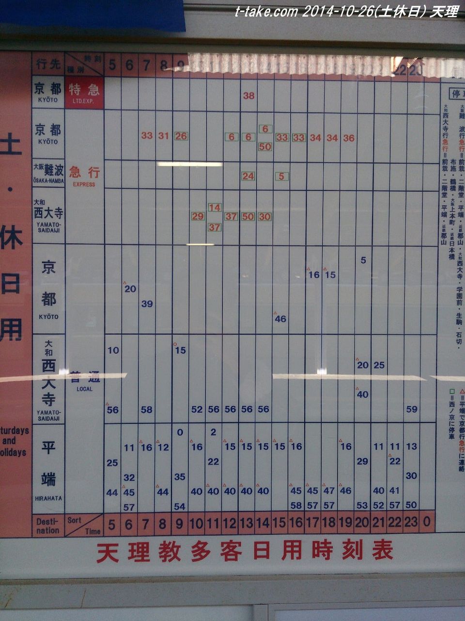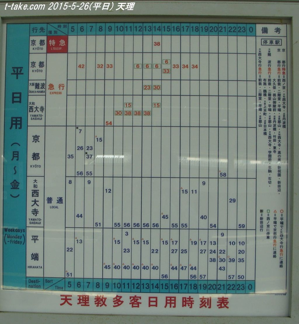 内容は、天理駅発、着、平端駅天理方面、大和西大寺駅京都方面、天理方面、大阪難波方面です。これ以外は撮影しておりません。何れも、平日、土休日揃っています。(平日は2015-5-26、土休日は2014-10-26に撮影)