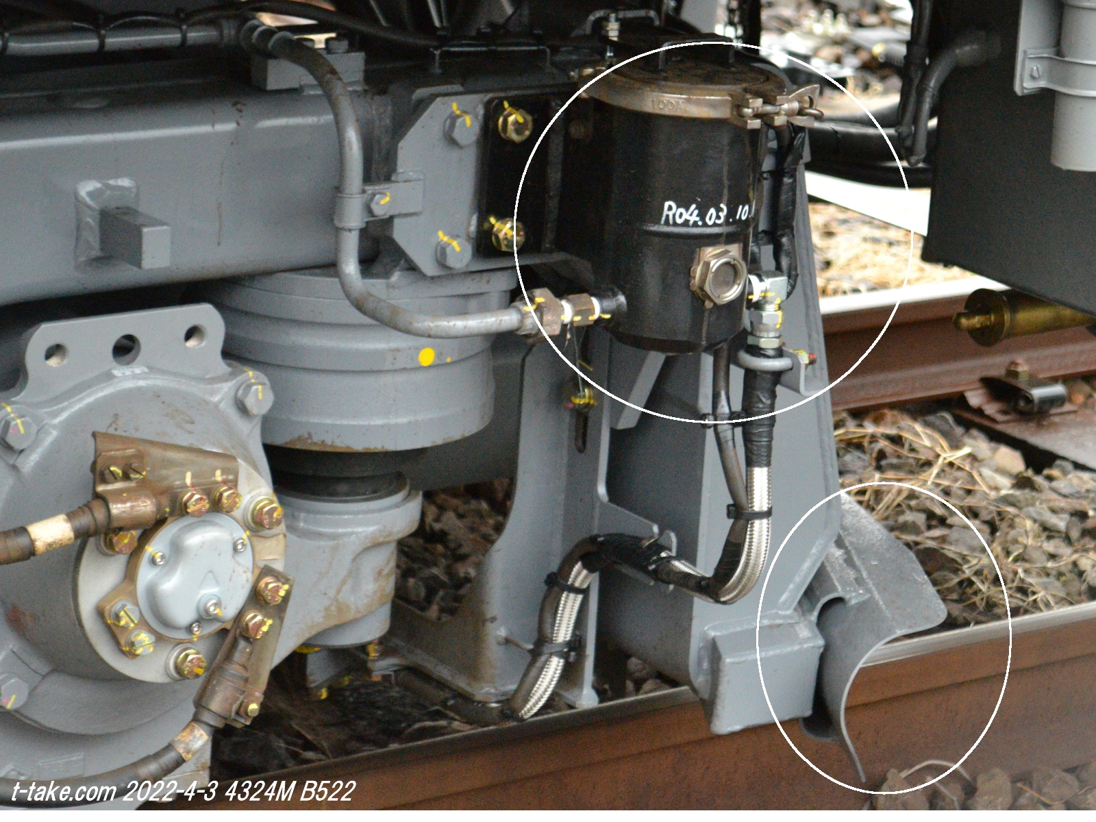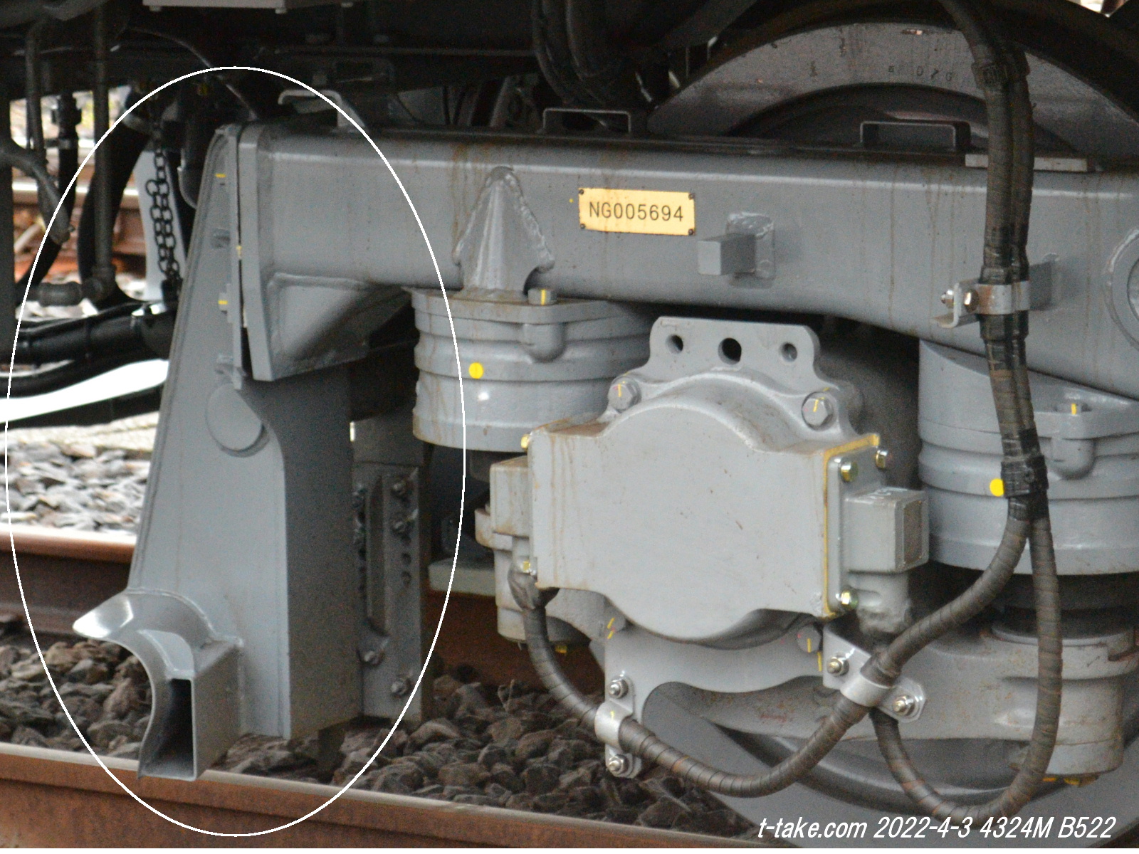 右画像上丸印は「セラジェット」となり、B500編成のクモハ台車で装着となります。ちなみに、左画像の「NG005694」は、クハ前位台車の番号です。
