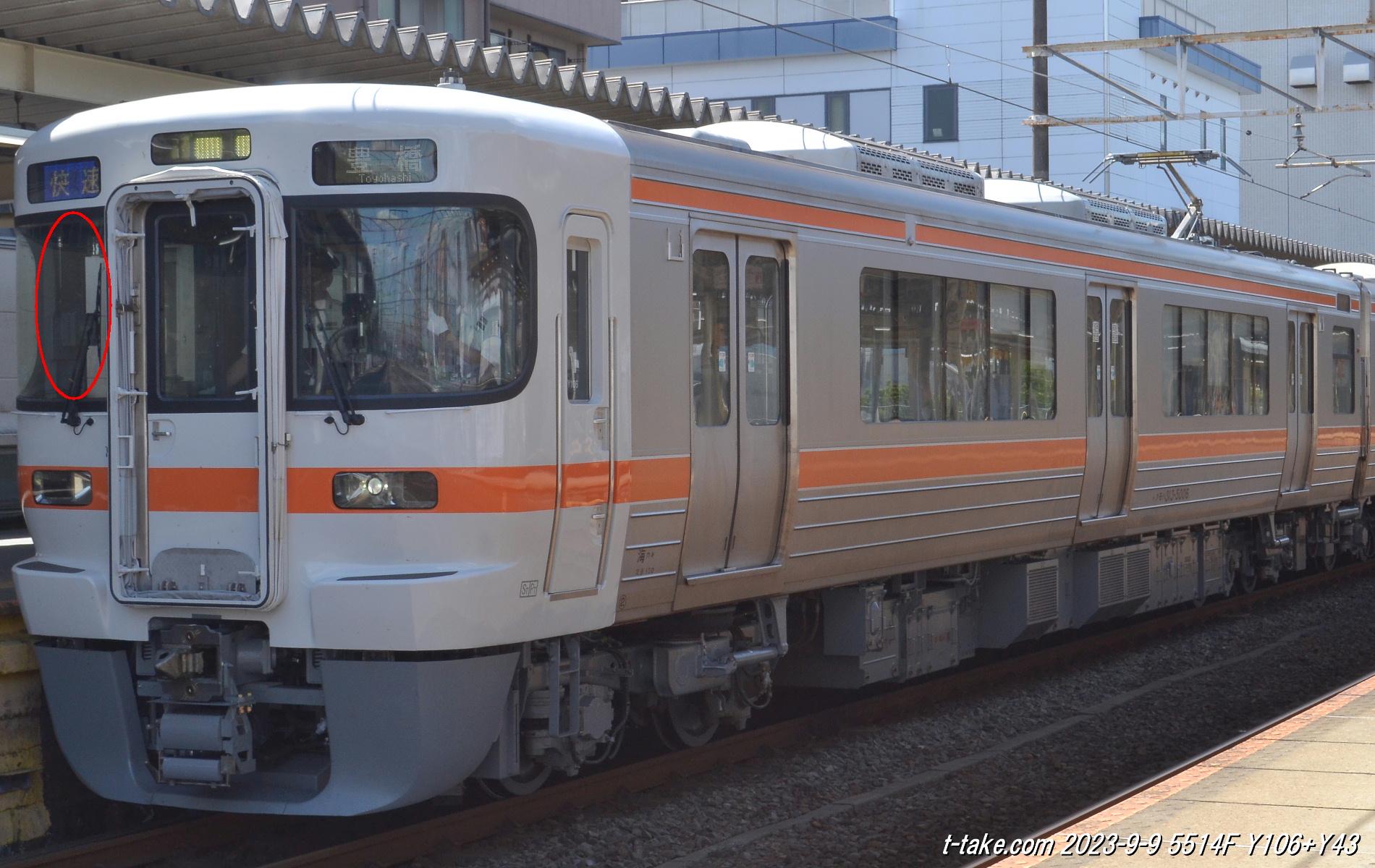 【画像】9月の検査出場でデシタル列車無線が取付となった、313系Y106編成、赤丸のダイバシティアンテナとモニタがその目印