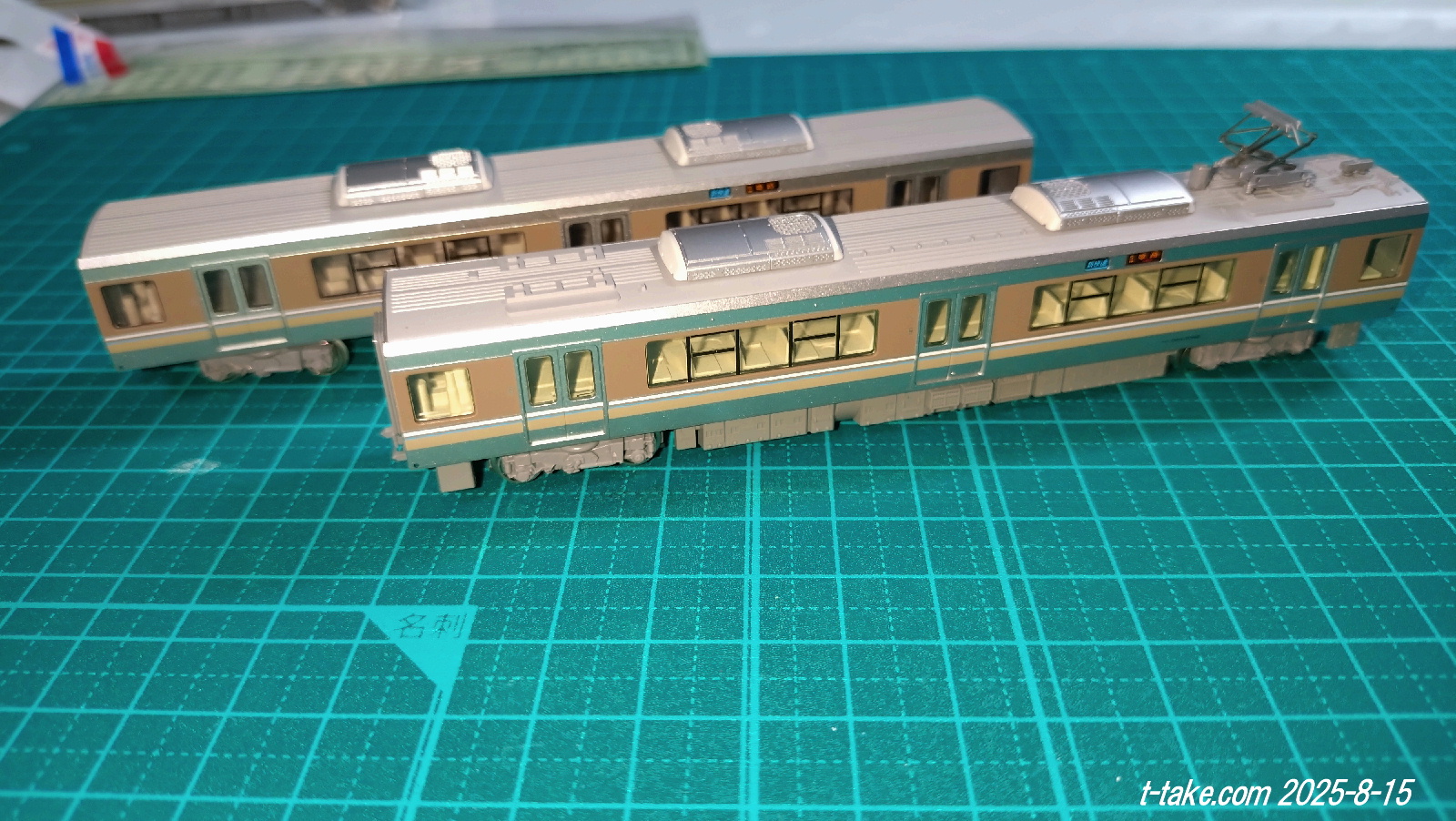 4両共バラで揃えたため、製品としての統一性もなく、クハ(右側)は、前面幌を取り付けていた前ユーザーの穴があり、タミヤパテで埋めた白色の部分も、色付けは未加工のまま。