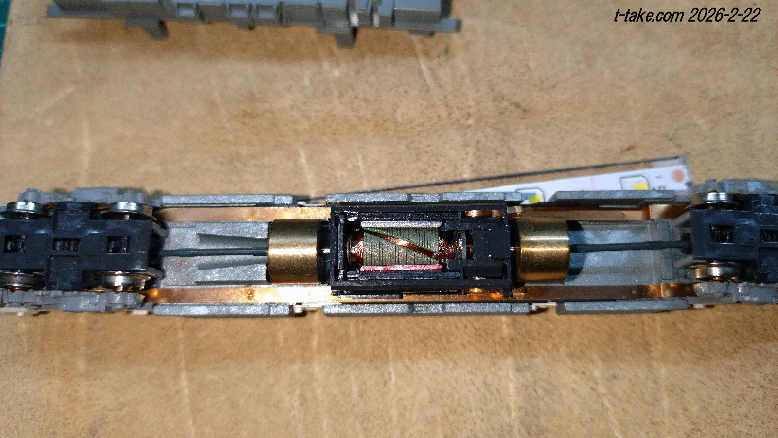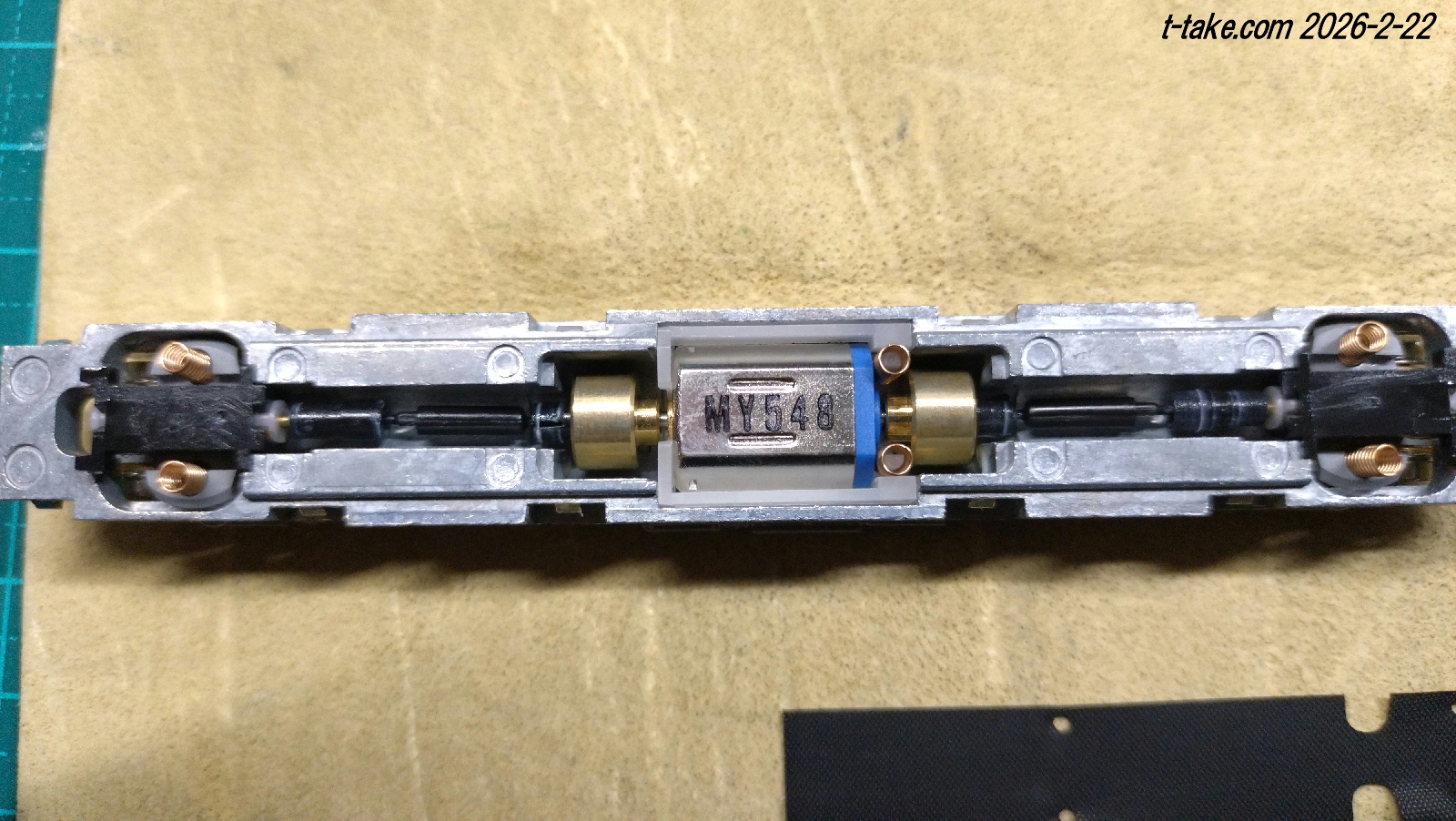 最初に「TOMIX 0623 M-9モーター」(2004/2月発売)となります。323系初期仕様(98230)に搭載のモーターでした。モーターに直接品番は書かれておらず、上画像のように、枕木方向の黒色が目印のようです。