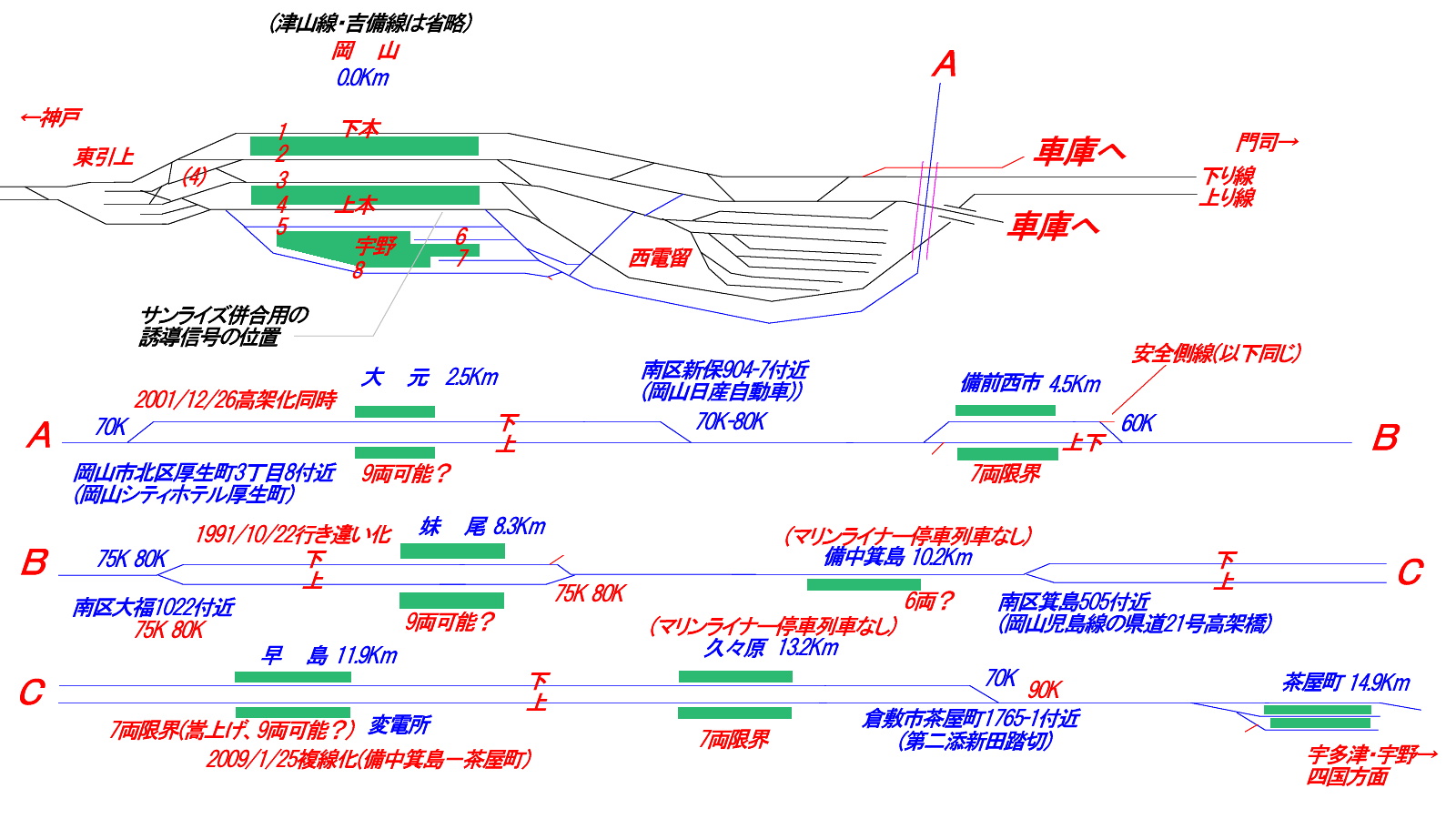 その岡山県区間も、2009/1/25で部分的に複線化となっています。上画像の配線図を見ても分かるように、妹尾の行き違い化でも1991年、他は単線区間介在でしたが、2001/12/26の大元駅高架化と、部分的な複線化、そして、備中箕島~茶屋町間の部分複線化が2009/1/25で果たしてます。
