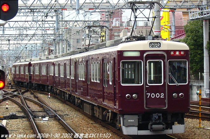 7002編成で、ようやく宝塚線に新製配置となり、最初から8両の鋼製車体、界磁チョッパ車となりました。これが、1992/4/16で神戸線へ、1995/1/28→1995/6/14で、震災の影響で一時的に宝塚線戻り(メンテナンスが容易な8000系を、御影-王子公園・三宮間で運転だったため)でした。