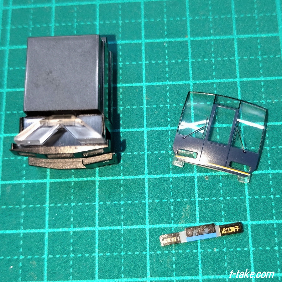 現在の実車は、運用番号表示は全車撤去されていますから、高さの違いは関係なく、そのまま、黒のビニールテープで遮蔽して、装着となりました。KATO製の同パーツは、光漏れがありますが、この場合はそれが殆どありません。