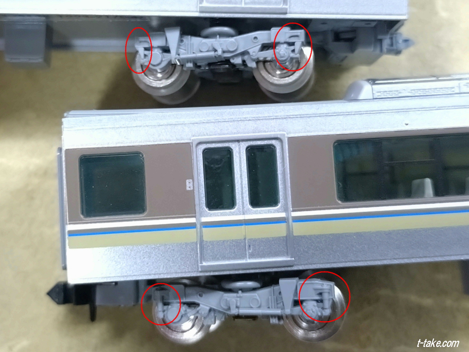 この、VVVFに限った床下パーツは、取り外しが可能な仕様でした。どれも東芝メーカーですが、三菱など、他のメーカー差異再現で、今後にも可能性がある感じですね。この「取り外し」は、手元にある225系、323系でも同様でした。
